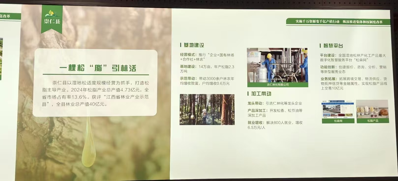 2025年9月28-29日,在江西资溪竹科技博物馆举行科技支撑抚州深化集体林改巡回服务活动之林业龙头企业产品展览会。国家林业部、各部门领导、江西省林业厅等领导参加了展览会,听取了抚州深化集体林权制度改革的报告,并参观了展览会。江西吉仁林化实业有限公司和松森网参展,总经理苏仕会先生向各位领导汇报“一县一品”松脂产业的发展、松脂产品研发和加工生产技术创新、产品附加值提升等方面情况,用好科技和网络等先进技术大力推进松脂深加工,提升产品附加值,增强产品竞争力。